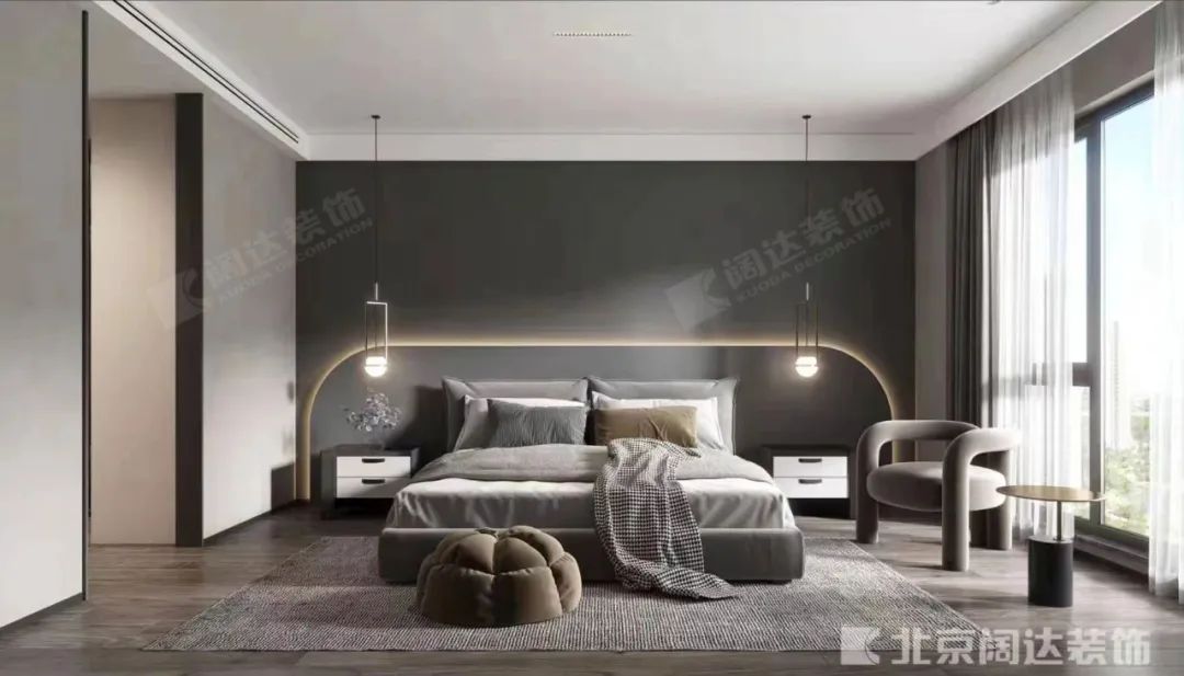 臥室是人在家中憩息的港灣,倦鳥歸林,整體營造出沉穩、安靜、高端的設計風格,使視覺以及精神感知方面得到雙重享受。