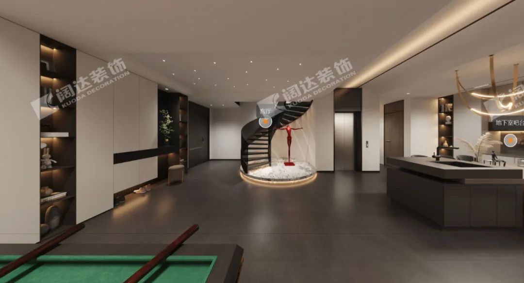 地下室入戶玄關:從地下車庫進入室內,儲物柜與換鞋區,被精心地設計成一處自然景觀,搭配星空頂,讓家更添藝術氣息與夢幻感,鋼結構的旋轉樓梯也保證了地下室的通透性和呼吸度?!盎貧w本真安寧的生活,從家開始?!?/span>